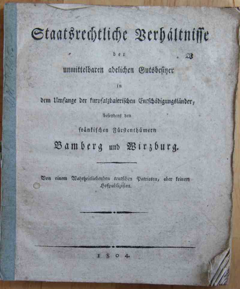 Franken - "Staatsrechtliche Verhältnisse der unmittelbaren adelichen Gutsbesitzer in dem Umfange der kurpfalzbaierischen Entschädigungsländer", besonders den fränkischen Fürstenthümern Bamberg und Wirzburg. o.O. u. V., 1804.